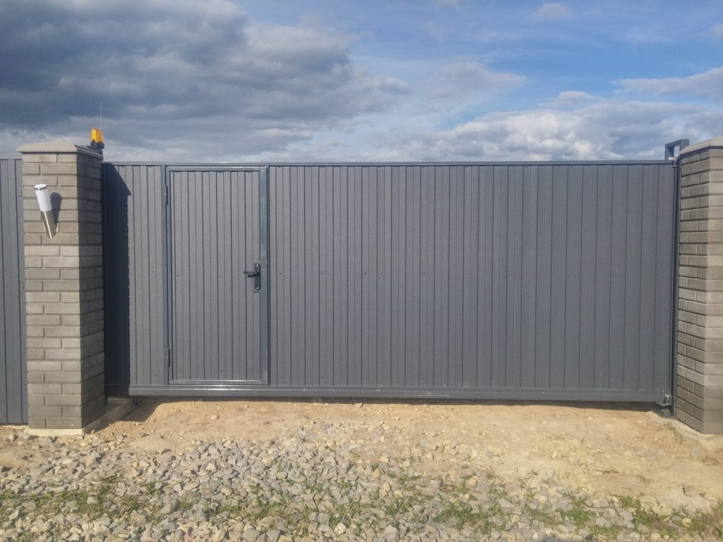 Откатные ворота из профнастила с встроенной калиткой